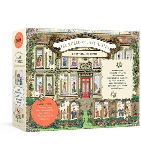 Get lost in the world of Jane Austen with this unique puzzle, which combines the fun of a jigsaw with the intrigue of a county ball as you read the clues and figure out the logic to build the final image. Featuring beloved characters from Lizzy Bennet and Mr. Darcy to Fanny Price and Edmund Bertram, The World of Jane Austen: A Conversation Puzzle invites you to build a whole new story as you piece it together. This 500-piece jigsaw puzzle is a unique experience for puzzle lovers. The pieces can be arranged in any order, but you have to read the conversations between characters from Jane Austen’s beloved novels in order to understand how the puzzle goes together. • First, put together the vignettes. Just like with any other puzzle, you use the visual clues to build each scene. • Then read the conversations in each vignette to help you solve the puzzle and put it together in the correct order. Each vignette has a similar border so you can’t just “see” how they fit together unless you read the clues. • To check your work, look at the back of the puzzle. If you’ve done it correctly you’ll reveal a quote from Jane Austen. ...