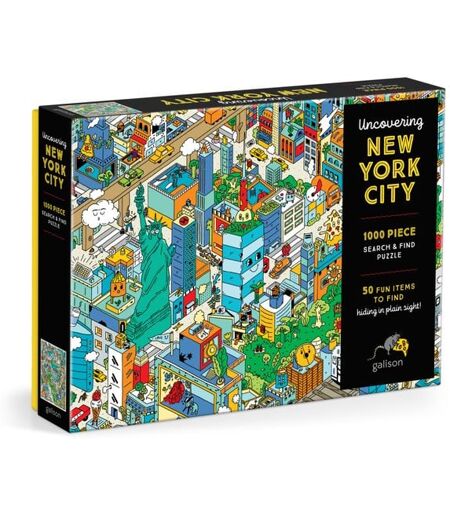 The Uncovering New York City 1000 Piece Search & Find Puzzle from Galison buries 50 fun items to find with an animated perspective on city life by Hyesu Lee. She is an illustrator, artist, muralist, and educator who uses comics as a medium without language barriers to capture vignettes of the everyday experiences that connect us all. • 50 fun items to find! • 1000 pieces, Ribbon Cut • Box: 11.25 x 8.25 x 2”, 286 x 210 x 51mm . • Puzzle: 27 x 20”, 686 x 508 mm • Includes Puzzle Insert with Search & Find list • Puzzle greyboard contains 90% recycled paper. Printed with nontoxic inks. ...