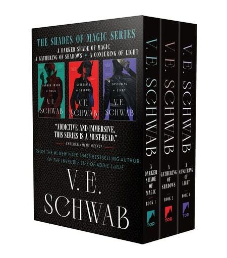 From #1 New York Times bestselling author V.E. Schwab, soar through the phenomenal Shades of Magic universe in this stunning trade paperback boxed set collecting all three volumes. Kell is one of the last Antari-magicians with a rare, coveted ability to travel between parallel Londons; Red, Grey, White, and, once, Black. Unofficially, Kell is a smuggler, servicing people willing to pay for even the smallest glimpses of a world they'll never see. It's a defiant hobby with dangerous consequences. A Darker Shade of Magic - Kell serves the Maresh Empire-Red London, as he calls it-as an official ambassador, traveling between the frequent bloody regime changes in White London and the court of George III in the dullest of Londons. After one such visit goes awry, Kell escapes his home for Grey London and runs into Delilah Bard, a cut-purse with lofty aspirations. Now perilous magic is afoot, and treachery lurks at every turn. To save all of the worlds, they'll first need to stay alive. A Gathering of Shadows - While Red London is caught up in the pageantry and thrills of the Element Games, another London is coming back to life, and those who were thought to be forever gone have returned. A Conjuring of Light - As darkness sweeps the Maresh Empire, the once precarious balance of power among the four Londons has reached its breaking point. Other books by V. E. Schwab The Invisible Life of Addie LaRue Villains Duology Vicious Vengeful ...