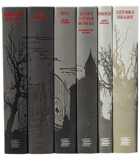 Dive into these six volumes of classic stories from the masters of the dark and macabre...if you dare. This collection of dark and haunting stories is an essential addition to the bookshelf of anyone who enjoys classic literature and tales of horror. The six volumes in this boxed set include short stories from esteemed authors such as Nathaniel Hawthorne, Edith Wharton, and H. P. Lovecraft; macabre works by Edgar Allan Poe and Washington Irving; the novels Dracula and Frankenstein; and more than 100 memorable fairy tales by the Brothers Grimm. Whether you’re in need of a few stories to tell around the campfire or a longer read at home on a cold winter’s night, you’ll find what you need in this specially designed Word Cloud collection. Full-color illustrations sprayed on the edges and a heat-burnished montage across all six spines make this a compelling addition to your bookshelf. This set includes the following titles: Classic Horror Tales (selected short stories) Dracula, by Bram Stoker The Brothers Grimm: 101 Fairy Tales Selected Works of Edgar Allan Poe Frankenstein, by Mary Shelley The Legend of Sleepy Hollow and Other Stories, by Washington Irving ...
