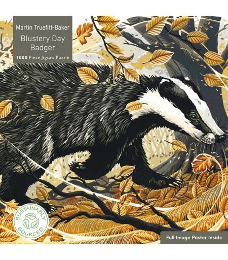 New title in the exciting series of ethical, sustainable and earth-friendly jigsaw puzzles from Flame Tree, featuring powerful and popular works of art, using ethically sourced materials, sturdy pieces and plastic-free packaging. Part of a new, exciting series of ethical, sustainable and earth-friendly jigsaw puzzles that feature powerful and popular works of art. The 1000 pieces will satisfy your need for a challenge, with the charming .Blustery Day Badgerby Martin Truefitt-Baker. Intended for adults and children over 13 years. Not suitable for children under 3 years due to small parts. Includes an A4 poster for reference. Finished Jigsaw size 735 x 510mm / 29 x 20 ins. Martin Truefitt-Baker is a fine art printmaker and painter living in the Brecon Beacons national park, South Wales, UK. His linocuts use a reduction method, printing from a single piece of lino. This is progressively cut away and overprinted onto paper several times, in a succession of tones, to build up the final image. The prints are of the animals he has seen on his walks through the local landscape, mostly within just a couple of miles of his home. Martin always tries to catch some of the magic in the way the animal moves and lives within its environment. The beautiful Usk valley, rough mountainsides, twisted trees, wild flowers and busy insects fill the backgrounds of his prints.SUSTAINABLY SOURCED. Flame Tree actively strives to promote ethical development and environmental conservation. ...