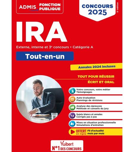 Binding : paperback, Edition : 5, Label : Concours d'accès aux IRA - Catégorie A - Tout-en-un : Instituts régionaux d'administration - Externe, interne et 3e concours - Concours 2025, Format : big_book, medium : paperback, numberOfPages : 288, publicationDate : 2024-11-27, languages : french, ISBN : 2311219472 ...