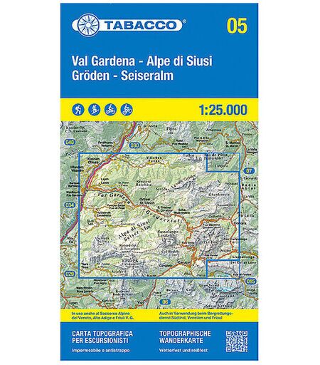 Carta topografica per escursionisti – Topographische Wanderkarte mit GPS-fähigem UTM-Gitter WGS84 mit Skitouren, Radwegen und Mountainbike-Strecken. impermeabile e antistrappo - wetterfest und reißfest Gewicht: 110 g Verlag: Casa Editrice Tabacco Reihe: Tabacco 1:25.000 Maßstab: 1:25.000 Sprache: Deutsch, Englisch, Französisch, Italienisch Erscheinungsjahr: 2022 Kontinent: Europa Land: Italien Bundesland / Provinz: Südtirol, Trentino Region: Dolomiten, Eisacktal, Fassatal, Ladinien Orte / Berge / Seen: Sella, Seiser Alm, Gröden, Langkofel, Canazei, Plattkofel, Piz Boè, Puez, Rosengarten, Villnöß, Schlern, Wolkenstein, Passo Pordoi, Grödner Joch, Tiers, Kastelruth, St. Ulrich, Lajen, Klausen, Raschötz ...