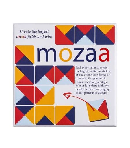 Mozaa is a colourful combination of domino and mosaic. It is the edge matching game that brings out the artist in you. The box contains 64 cards (tiles) which all have a unique colour combination. Take a playing card from the stack and place it next to the cards on the table, in such a way that the colours on the edges match. The one who creates the most and largest colour fields wins the game. You can build your own colour fields or block the expansions of other players' fields. Whatever strategy you choose, and whether you win or lose, the end result will always be a different and beautiful mosaic pattern. ...