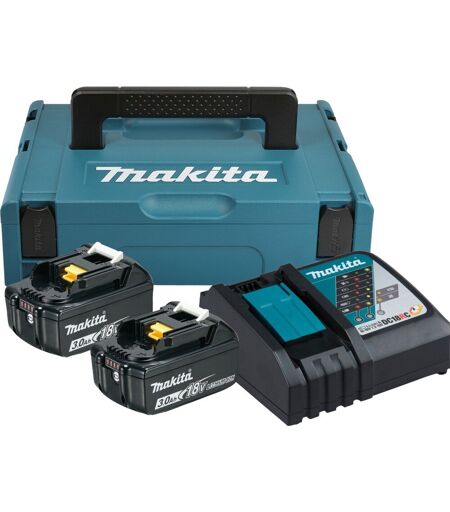 Das Power Source Kit MKP1RF182 (197952-5) von MAKITA enthält das Schnelladegerät DC18RC, 2 Stück Akku BL1830B (18 Volt, 3Ah) und den praktischen Werkzeugkoffer Makpac Größe 1. ...