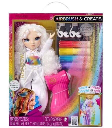 Ein neuer Charakter in einem wunderschönen weißen Outfit mit langem, weißem Haar. Mit dem innovativen Airbrush-Tool lassen sich individuelle Farbdesigns mühelos auftragen. Alternativ können die vier mitgelieferten Marker in Regenbogenfarben verwendet werden, um Kleidung, Schuhe und Haare direkt zu gestalten. Die Farben sind auswaschbar, sodass immer wieder neue Looks kreiert werden können. Eine Stickerschablone erleichtert das Auftragen von Formen. ...