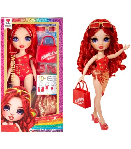 Tauche ein in die Welt der Rainbow High mit den Puppen aus der Reihe Swim & Style! Zeige deine wahre Farbenpracht und lasse deine Einzigartigkeit strahlen. Die bezaubernde Ruby lädt dazu ein, kreative und farbenfrohe Geschichten zu erzählen. Die etwa 28 Zentimeter große Ruby verführt mit einem vielseitigen Wickeltuch, das auf über 10 Arten gestylt werden kann - für fantasievolle Styling-Abenteuer. Sammle alle Swim & Style Puppen und erlebe, wie sie gemeinsam die Fantasie beflügeln - ob im Einzelspiel oder im bunten Mix. Sei kreativ, sei du selbst und lass deine Persönlichkeit mit Ruby in leuchtendem Rot erstrahlen! ...