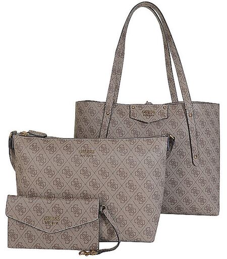 Damen Shopper aus recyceltem Lederimitat mit Allover-Logo-Muster Zwei Schulterriemen Logo in Metall-Lettern vorne Großes Hauptfach Herausnehmbare Innentasche mit kurzem Tragegriff (kann auch separat getragen werden) Minitäschchen für Kleinigkeiten am Riemen Farbbezeichnung: Latte Logo Maße: ca. 42x26x14 cm Maße2: 32x21x7 cm Material: 100% Polyurethan (recycled) ...