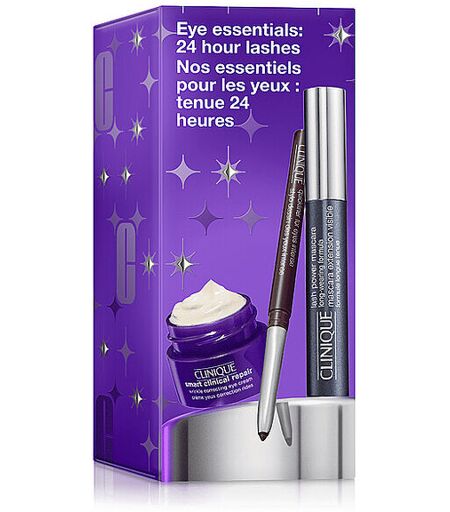 Ein Trio für atemberaubende Looks und Wimpern, die lange halten. Enthält eine Augencreme, einen Liner und eine langanhaltende Mascara. * Die Clinique Smart Clinical Repair™ Wrinkle Correcting Eye Cream kräftigt und glättet sichtbar die feine Haut rund ums Auge. * Quickliner™ For Eyes Intense ist ein hochpigmentierter, automatischer Konturenstift zum Betonen und Verwischen in einem. * Lash Power™ Mascara Long-Wearing Formula beeindruckt 24 Stunden lang, ohne zu verschmieren. Die einzigartige Bürste erreicht und verlängert auch die kleinsten Härchen für wunderschöne aussehende Wimpern. * Wie für jedes Augen-Make-up gilt auch hier: Quickliner™ For Eyes Intense und Lash Power™ Mascara halten das Clinique Versprechen für Deine Augen. : * Augenärztlich getestet * Sicher für sensible Augen * Sicher für Kontaktlinsenträger:innen Dermatologische Expertise * Dermatologisch getestet. * Allergiegetestet. * 100 % Parfumfrei. Frei von * Duftstoffen Set enthält: Clinique Smart Clinical Repair™ Wrinkle Correcting Eye Cream, 0.17oz/5ml Quickliner™ for Eyes Intense in Intense Chocolate, 0.005oz/0.14g Anwendung: * Trage die Clinique Smart Clinical Repair™ Wrinkle Correcting Eye Cream auf die Augenpartie auf und massiere sie sanft in die Haut ein. Zweimal täglich, morgens und abends, anwenden. * Konturiere die Augen mit dem Quickliner™ For Eyes Intense und verwende dann das Verwisch-Ende, um die Farbe für die gewünschte Wirkung sanft zu verblenden. Lass die Farbe 60 Sekunden lang einwirken, damit sie nicht verschmiert. * Trage Lash Power™ Mascara vom Wimpernkranz ausgehend mit der Bürste bis in die Wimpernspitzen auf. Zum Aufbauen wiederholen. Dank der innovativen Thermotechnologie von Clinique hält diese Formel 24 Stunden – und kann dennoch leicht mit warmem Wasser wieder entfernt werden. Mit den Fingerspitzen mehrfach warmes Wasser (Badetemperatur ist ideal) auf die Wimpern spritzen und vorsichtig andrücken. Alternativ mit einem mit warmem Wasser angefeuchtetem Wattepad leicht aufs Auge drücken und abwischen. INCI: WaterAquaEau, Acrylates Copolymer, Kaolin, Copernicia Cerifera (Carnauba) Wax Copernicia Cerifera Cera Cire De Carnauba, Peg-15 Glyceryl Stearate, Silica, Butylene Glycol, BeeswaxCera AlbaCire D'Abeille, Alcohol, Hydrogenated Rapeseed Alcohol, Bentonite, Polyvinyl Alcohol, Sucrose Distearate, Stearic Acid, Simmondsia Chinensis (Jojoba) Seed Oil, Dimethicone, Simethicone, Vp/Va Copolymer, Nylon-66, Tocopherol, Aminomethyl Propanediol, Aminomethyl Propanol, Xanthan Gum, Chlorphenesin, Sodium Dehydroacetate, Phenoxyethanol, [+/- Iron Oxides (Ci 77491), Iron Oxides (Ci 77492), Iron Oxides (Ci 77499), Titanium Dioxide (Ci 77891), Carmine (Ci 75470), Yellow 5 Lake (Ci 19140), Blue 1 Lake (Ci 42090), Ultramarines (Ci 77007), Bismuth Oxychloride (Ci 77163), Chromium Oxide Greens (Ci 77288), Manganese Violet (Ci 77742), Chromium Hydroxide Green (Ci 77289)] <ILN45296>Rds Product Name: Quickliner... ...