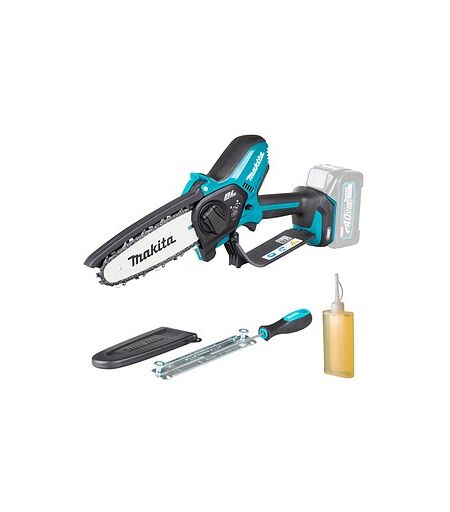 makita UC029GZ Akku-Kettensäge 40,0 V max., ohne Akku – kraftvoll, leicht und präzise für vielseitige EinsätzeDie Makita Kettensäge UC029GZ kombiniert handliches Design mit moderner Akku-Technologie und bietet so effizientes Arbeiten bei verschiedenen Schneidaufgaben.Leichtgewicht mit starker Leistung und kabelloser FreiheitMit nur 1,3 kg Gewicht ermöglicht dieses Exemplar ermüdungsarmes Arbeiten auch über längere Zeit. Die Schwertlänge von 15 cm ist optimal für kleinere bis mittlere Schnitte, während die Kettengeschwindigkeit von 8 m/s kraftvolle Schnitte gewährleistet. Der bürstenlose Motor sorgt für hohe Effizienz und lange Lebensdauer.Komfortabler Umgang dank werkzeuglosem KettenwechselDie Kettensäge ist mit einem werkzeuglosen System zum Wechseln und Spannen der Kette ausgestattet, das schnelle Anpassungen ermöglicht. Die automatische Kettenschmierung mit Sichtfenster am Öltank gewährleistet eine konstante Schmierung und damit eine längere Lebensdauer der Kette und des Schwerts.Robust und geschützt mit moderner SchutztechnikDank der Extreme Protection Technology (XPT) ist das Gerät gegen Staub und Spritzwasser geschützt, was es auch für anspruchsvolle Bedingungen im Außenbereich geeignet macht. Die elektronische Rückschlagbremse und der beidseitig zugängliche Absperrhebel erhöhen die Sicherheit während der Arbeit.Lieferumfang und AkkuhinweisDie Kettensäge wird ohne Akku und Ladegerät geliefert, enthält jedoch Sägeschiene, Sägekette, Sägekettenöl, Sägekettenschutz sowie Feilenhalter mit Rundfeile. So sind Sie gut ausgestattet, um direkt mit der Arbeit zu beginnen.Ergänzen Sie Ihre Ausrüstung mit der Makita Kettensäge UC029GZ für kraftvolles und flexibles Arbeiten im Garten und Werkstattbereich. ...