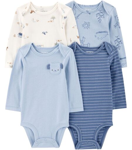 Praktischer Mehrfachpack: Die netten Bodys von Carter's sind perfekt für den täglichen Gebrauch. 4er-Pack Langarmbodys von Carter's Body 1 + 2 Allover-Print mit Farm-Motiven, Body 3 unifarben mit Brusttasche im Hunde-Design, Body 4 Ringel-Look Schlupfkragen Druckknöpfe im Schrittbereich aus reiner Baumwolle ...