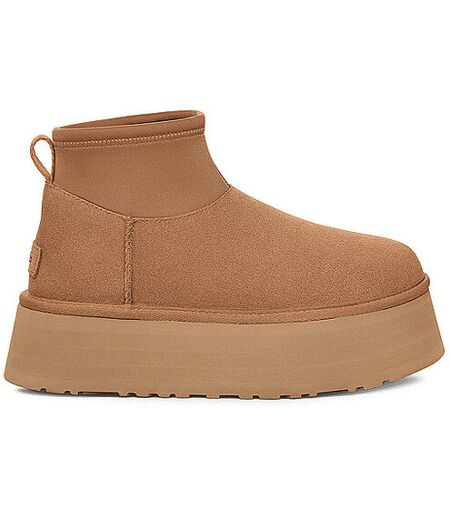 Warme Damen Boots Fersenkappe aus Veloursleder, Zuglasche hinten aus 100 % recycelten Polyesterfasern, Schuhblatt aus Veloursleder, Schaft aus Neopren 17 mm dickes Schuhblattfutter aus UGGplush™ (60 % upgecycelte Wolle, 40 % TENCEL™ Lyocell) 17 mm dicke Einlegesohle aus UGGplush™ (60 % upgecycelte Wolle, 40 % TENCEL™ Lyocell) Fußbett aus Schaumstoff EVA-Zwischensohle EVA-Außensohle aus Zuckerrohr Textilbindung aus 100 % recycelten Polyesterfasern 5 cm Plateauhöhe Fersenetikett aus Veloursleder mit UGG® Logoprägung Ideal für: Freizeit Farbbezeichnung: Chestnut Material: 100% Leder ...