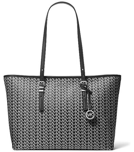 Damen Shopper aus Jacquard mit Allover-Logo Muster Details aus Leder Silberfarbene Hardware Mit zwei Tragegriffen Großes Hauptfach Logo Anhänger Farbbezeichnung: Black Maße: ca. 13,34 cm (B) × 27,94 cm (H) × 46,99 cm (T) Material: 87% Polyester, 12% Polyurethane, 1% Polyacryl Besatz: Leder ...