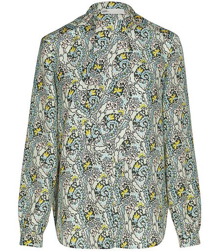 Modische Damen Bluse aus reiner Seide Rundhalsausschnitt mit Schluppe zum Binden Schließt mit Knopfleiste Langarm mit schmalen Manschetten Alloverprint Gerade Passform Farbbezeichnung: Blue Abstract Material: 100% Seide ...
