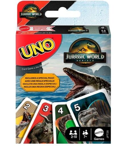 Fans von Jurassic World Rebirth werden dieses themenbezogene UNO-Kartenspiel lieben. Mit Karten, deren Bilder von Lieblingscharakteren und -szenen inspiriert sind, versuchen die Spieler, passende Farben und Zahlen zu finden. Es gibt sogar die Sonderregel Angriff des T-Rex“; bei der die Spieler fünf zusätzliche Karten ziehen müssen! Und natürlich dürfen die Spieler nicht vergessen, laut UNO!“ zu rufen, wenn sie nur noch eine Karte auf der Hand haben! Ein tolles Geschenk für Fans von Jurassic World Rebirth und Kartenspiel-Liebhaber ab 7 Jahren. Abweichungen in Farbe und Gestaltung vorbehalten. ...