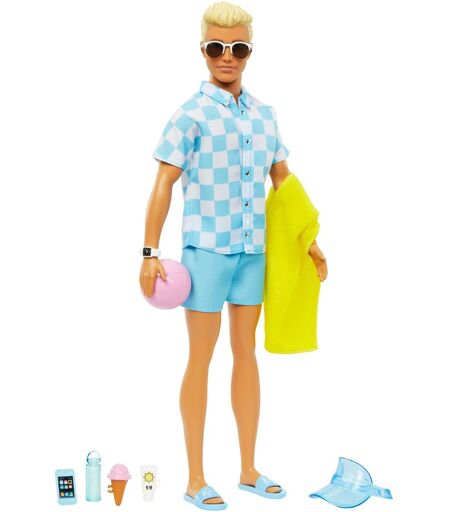 Die Zehen im Sand, ein Eis in der Hand und schon ist diese blonde Ken-Puppe bereit für einen entspannten Tag in Malibu. Er trägt ein blau-weiß kariertes Hemd und eine dazu passende himmelblaue Badehose. Auf den glänzenden, blauen Sandalen ist das Ken-Logo abgebildet. Weitere Accessoires sind ein Sonnenschild, eine Sonnenbrille, eine Uhr, ein Handtuch, eine Wasserflasche, Sonnencreme und ein Smartphone. Mit dem Wasserball ist Ken bereit zum Spiel mit seinen Freunden. Für realistische Posen lässt sich die Eistüte an seiner Hand befestigen. ...