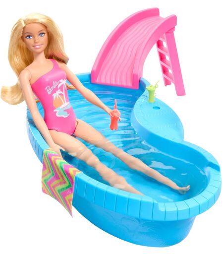 Jede Menge Spielspaß mit Barbie am Pool: Dieses Set enthält eine Barbie-Puppe im pinken Badeanzug mit Sonnenuntergangs-Motiv und einen Pool mit Rutsche. Der Pool kann mit Wasser gefüllt werden - nun kann Barbie die Rutsche herunterrutschen und mit einem großen Platsch im Pool landen. Mit farbenfrohem Zubehör wie einem Handtuch und zwei Getränken ist dieses Set bereit für die Poolparty. ...