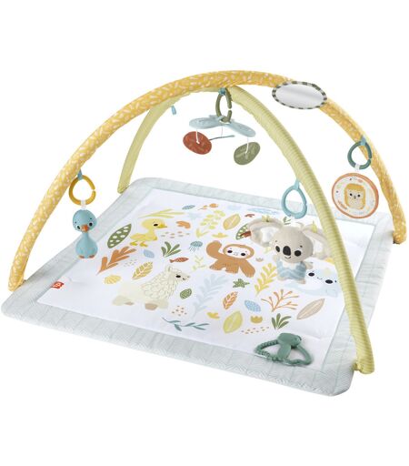 Mit dieser Erlebnisdecke von Fisher-Price mit integriertem Spielbogen entdecken Neugeborene spielerisch die Welt. Der Bogen kommt mit 6 frei positionierbaren, sensorischen Spielzeugen: Ein Plüsch-Koala mit leisen Klingelgeräuschen, ein Mobile, das auch an einem Kinderwagen angebracht werden kann, ein Spiegel, um sich selbst zu entdecken, eine Rassel im Gans-Design, einen BPA-freien Beißring im Falter-Design und ein weiches, knisterndes Spielzeug, das am Boden befestigt werden kann. Die Spielmatte ist mit farbenfrohen Tiermotiven dekoriert und maschinenwaschbar. Durch Verstellmöglichkeiten wächst dieses Spielzeug mit dem Kind mit. ...