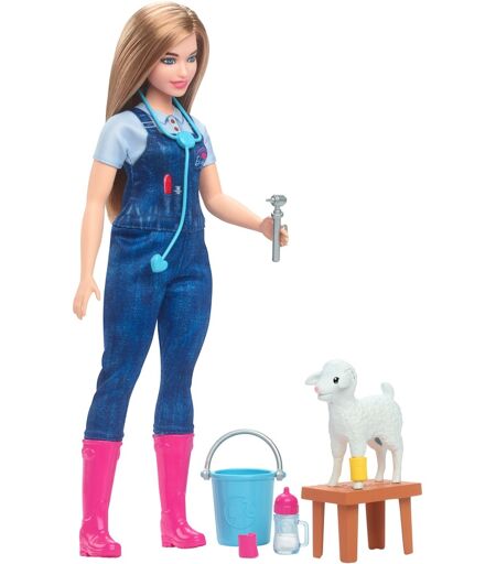 Zum 65. Jubiläum präsentiert Mattel eine weitere Barbie-Puppe aus der Karriere-Serie: Die Bauernhof-Tierärztin ist für jeden Notfall gut ausgerüstet. Sie trägt ihre Berufskleidung - eine Latzhose mit Taschendetails und pinke Gummistiefel. 10 Zubehörteile passen perfekt in das Tierarzt-Thema dieses Sets. Mit dabei sind unter anderem eine Bank, ein Eimer, ein Reflexhammer, ein herzförmiges Stethoskop und zwei Gipsverbände, die dem Lamm angelegt werden können. Bekommt das niedliche Lämmchen sein Arzneimittel aus der Flasche, wackelt es süß mit den Ohren! Die Kleidung der Puppe ist ausziehbar. ...