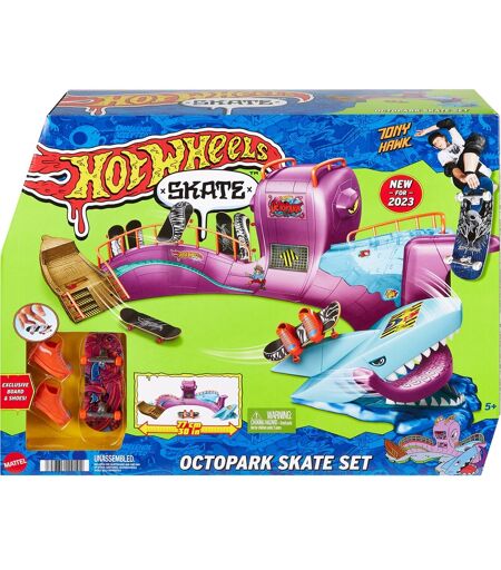Das Hot Wheels Skate Octopark Skate-Set lädt zum stylishen Skaten ein. Los geht die wilde Fingerskating-Fahrt auf dem riesigen Oktopuskopf, weiter zu den Grind-Rails, vertikalen Quarter-Pipes und zum zuschnappenden Haikopf. Ein exklusives, zusammengebautes Fingerboard und abnehmbare Skateschuhe sind im Lieferumfang enthalten. Im Aufbewahrungsfach auf der Rückseite finden drei weitere Boards und fünf Paar Schuhe Platz. Zusätzliche Skateboards und Schuhe separat erhältlich. ...