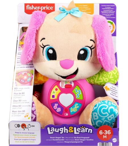 Die Lernspaß Hundefreundin mit Smart Stages von Fisher-Price ist ein kuscheliges Musikspielzeug, das schon die Kleinsten an das Alphabet, Formen, erste Wörter und vieles mehr heranführt. Die Kleinen können auf fünf verschiedene Knöpfe auf dem Bauch des Hündchens drücken, um sein Herz in verschiedenen Farben aufleuchten zu lassen, während 80 Lieder, Töne und Sätze abgespielt werden. Mit 12 Original-Liedern und drei verschiedenen Smart Stages-Lernstufen, die mit dem Kind mitwachsen, wird dieses niedliche und kuschelige Hündchen schnell zur besten Freundin - und dies auch mehrsprachig. Mit der Globus-Taste kann die gewünschte Sprache ausgewählt werden, wobei Englisch, Französisch, Deutsch, Italienisch oder Niederländisch möglich sind. ...