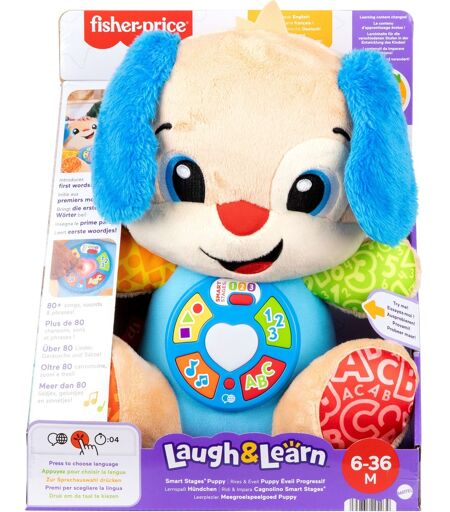 Das Lernspaß Hündchen mit Smart Stages von Fisher-Price ist ein kuscheliges Musikspielzeug, das schon die Kleinsten an das Alphabet, Formen, erste Wörter und vieles mehr heranführt. Die Kleinen können auf fünf verschiedene Knöpfe auf dem Bauch des Hündchens drücken, um sein Herz in verschiedenen Farben aufleuchten zu lassen, während 80 Lieder, Töne und Sätze abgespielt werden. Mit 12 Original-Liedern und drei verschiedenen Smart Stages-Lernstufen, die mit dem Kind mitwachsen, wird dieses niedliche und kuschelige Hündchen schnell zum besten Freund - und dies auch mehrsprachig. Mit der Globus-Taste kann die gewünschte Sprache ausgewählt werden, wobei Englisch, Französisch, Deutsch, Italienisch oder Niederländisch möglich sind. ...