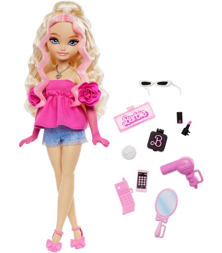 Die Puppen aus der Serie Barbie Dream Besties ermutigen dazu, dass alle ihre Talente entfalten und mit der Welt teilen können! Jede Puppe ist beweglich und kommt mit einer Auswahl abnehmbarer Kleidung und passenden Accessoires zu einem bestimmten Thema - perfekt zum Ausprobieren verschiedener Styles. Barbie Malibu träumt davon, ihre eigene Make-up-Firma zu besitzen: Sie hat langes, blond-gewelltes Haar, das zu einem Zopf gebunden ist. Pinkes Haar rahmt ihr Gesicht ein, um ihre ausdrucksstarke Persönlichkeit zu unterstreichen. Sie bringt Accessoires zum Thema Schönheit mit, etwa ihre Handtasche, eine Sonnenbrille, einen Haartrockner, einen Handspiegel, Lippenstift und Rouge sowie ein Smartphone und eine Hülle. ...