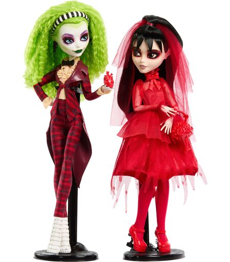 Wie sagt man so schön: "Heiraten in Rot? Da wäre ich lieber tot!“ Zumindest, wenn Betelgeuse das Ja-Wort gibt. Lydia Deetz und die berüchtigte Bio-Exorzistin persönlich kehren mit diesem schaurigen Puppen-2er-Pack in die Welt von Monster High Skullector zurück. Inspiriert von der Hochzeitsszene im Film "Beetlejuice Beetlejuice" sind diese Sammelfiguren eine Hommage an die merkwürdige und ungewöhnliche Mode, die selbst einen Sandwurm aus der Bahn wirft. Betelgeuse trägt einen gestreiften 3-teiligen Anzug mit Rüschenkragen, Kunstleder-Highlights und Schuhen mit Grabstein- und Käfer-Absätzen. Lydia hat ihr bestes und schrecklichstes Outfit an: Ein blutig rotes Brautkleid mit Schleier, Schleife und einen zackigen gepunkteten Rock. Mit einem Herz in den Händen stellt Betelgeuse ihre wahre Liebe unter Beweis. Lydia trägt einen Strauß, der gleichzeitig eine Handtasche ist. Beide Puppen sind etwa 29 Zentimeter groß und kommen in einer aufwendig gestalteten Deluxe-Verpackung - ideal für Sammler! ...