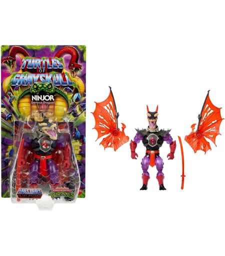 Mit den Actionfiguren der Serie Turtles of Grayskull trifft Masters of the Universe auf die Teenage Mutant Ninja Turtles: Eine Explosion im Technodrome sendet die Teenage Mutant Ninja Turtles in die andere Dimension nach Eternia, wo sie sich mit MOTU-Helden im Kampf um die Macht von Grayskull zusammentun! Die Figuren dieser Serie sind jeweils etwa 14 Zentimeter groß und können mit 16 Bewegungspunkten tolle Kampfposen einnehmen. Jede Figur ist mit einer von den Turtles inspirierten Rüstung und zur Geschichte passendem Zubehör ausgestattet. Ein Mini-Comic zeigt die Crossover-Story - eine tolle Anregung für kreatives Spiel. Die nostalgischen Grafiken auf der Verpackung begeistern Sammler. Kaum wiederzuerkennen als der tödliche Kampfkunstmeister im Bunde mit Skeletor, wurde Ninjor in einen geflügelten, drachenköpfigen Dämon mit wild aussehenden Reptilienkrallen mutiert. Er hat einen beweglichen Hals, Kiefer und abnehmbare Flügel. Bewaffnet ist er mit einem schlangenähnlichen, gehörnten Harnisch mit Metalldetails und einem durchscheinenden roten Schwert. ...