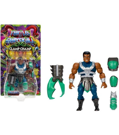 Mit den Actionfiguren der Serie Turtles of Grayskull trifft Masters of the Universe auf die Teenage Mutant Ninja Turtles: Eine Explosion im Technodrome sendet die Teenage Mutant Ninja Turtles in die andere Dimension nach Eternia, wo sie sich mit MOTU-Helden im Kampf um die Macht von Grayskull zusammentun! Die Figuren dieser Serie sind jeweils etwa 14 Zentimeter groß und können mit 16 Bewegungspunkten tolle Kampfposen einnehmen. Jede Figur ist mit einer von den Turtles inspirierten Rüstung und zur Geschichte passendem Zubehör ausgestattet. Ein Mini-Comic zeigt die Crossover-Story - eine tolle Anregung für kreatives Spiel. Die nostalgischen Grafiken auf der Verpackung begeistern Sammler. Obwohl er immer noch erkennbar ist, hat sich der charakteristische Klammerarm des heldenhaften Kriegers Clamp Champ zu einer Viper-Kampfklaue mit beweglichem Kiefer entwickelt! Sein einzigartiger Look umfasst Rüstungsteile im Schlangenhaut-Stil auf Oberkörper und Beinen, sowie abnehmbares Gurtzeug und eine Rock-Rüstung. Seine Nicht-Krallen-Seite ist mit abnehmbaren Rüstungsteilen geschützt. ...