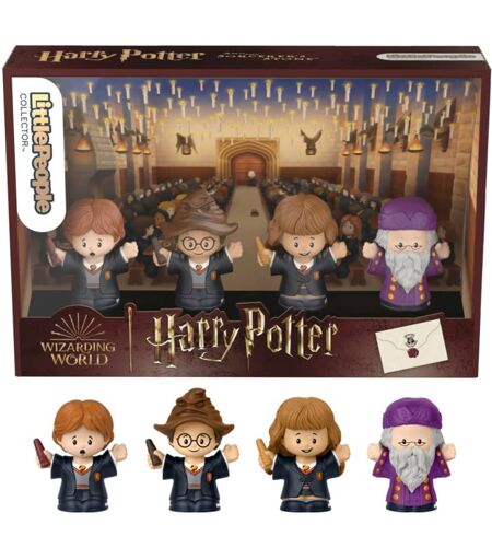 Dieses Little People Collector Sondereditionsset ist eine Hommage an den ersten Film der Harry-Potter-Reihe. In "Harry Potter und der Stein der Weisen" entdecken Harry und seine Freunde die magische Welt von Hogwarts. Mit diesem Figurenset, zu dem Harry Potter, Ron Weasley und Hermine Granger in Schuluniformen sowie der Schulleiter Albus Dumbledore in seinem purpurroten Mantel gehören, kann die Zuordnungszeremonie des sprechenden Huts in der Hogwarts-Schule für Hexerei und Zauberei nachgespielt werden. Durch die ansprechende Verpackung mit bekannten Bildern aus dem Film erwacht die große Halle von Hogwarts zum Leben und lässt das Herz von Sammlern und Fans höher schlagen. Die Figuren sind jeweils etwa 6 Zentimeter groß. ...