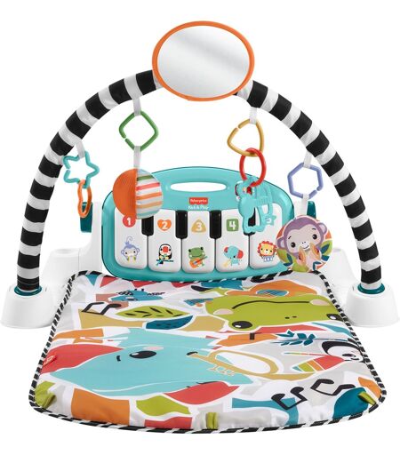 Mit der Kick & Play Piano Spieldecke von Fisher-Price gibt es für Neugeborene jede Menge zu entdecken: Die weiche, maschinenwaschbare Spieldecke wird mit einem verstellbaren Spielbogen kombiniert, an dem 10 Spielzeuge befestigt werden können. Highlight ist das abnehmbare Mini-Klavier mit 5 aufleuchtenden Taste, einer mehrfarbigen Lichtshow und 4 Musikeinstellungen. Zusätzlich gibt es eine Klingelkugel, einen Beißring in Schmetterlingsform, ein Knisterspielzeug, einen Spiegel und 6 bunte Formen, die jeweils mit Schlaufen befestigt werden können. Über sich anpassende Lerninhalte wächst dieses Spielzeug mit und sorgt so für anhaltenden Spiel- und Lernspaß. ...