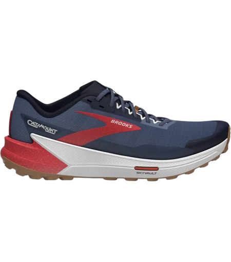 Der Brooks CATAMOUNT 2 Damenlaufschuh - Leicht und reaktiv, damit du auf den Trails schneller und weiter laufen kannst. Antrieb bergaufwärts Die brandneue SkyVault Propulsion Plate bietet genau den reaktiven Antrieb, den du für den Lauf bergauf und für extra Tempo benötigst. Leichte, reaktive Dämpfung Die DNA FLASH Zwischensohle ist mit Stickstoff angereichert und bietet die perfekte Kombination aus Reaktivität und adaptiver Dämpfung für einen schnellen Lauf. TrailTack-Grip Sichere aber dennoch flexible Verstärkungen im Mittelfußbereich, sowie die Half-Bootie-Zungenkonstruktion sorgen dafür, dass dein Fuß nicht verrutscht Weitere Details zum Brooks CATAMOUNT 2 für Damen: Eine TPU-Zehenkappe sowie ein besonderer Schlammschutz schützen vor nassem Schmutz, Steinen und Geröll und sorgen für Komfort und Langlebigkeit Die Drainageschlitze lassen Wasser schnell entweichen, damit deine Füße rascher trocknen Die neue SkyVault Propulsion Plate lässt dich zügig bergauf laufen und schützt dich dabei vor Steinen Das beidseitige Air Mesh zeichnet sich durch eine abriebfeste, wasserabweisende TPEE-Außenschicht und eine Innenschicht aus 100 % recycelten Polyesterfasern aus. Es trocknet schnell und bietet zugleich ein softes, angenehmes Tragegefühl Gewicht: 244g Sprrengung: 6mm Farbe: Navy / Bittersweet / Peacoat ...