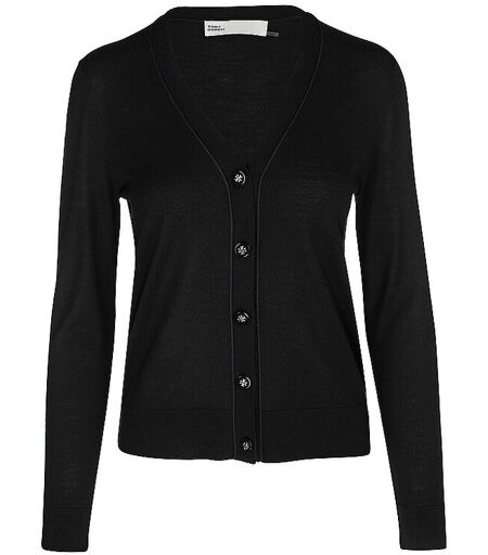 Damen Cardigan in hochwertiger Strickqualität aus Wolle und Seide V-Ausschnitt Schließt mit elegant verzierten Knöpfen Langarm Rippabschluss an Ärmel und Saum Gerade geschnitten Weicher Griff Farbbezeichnung: Black Material: 70% Wolle, 30% Seide ...