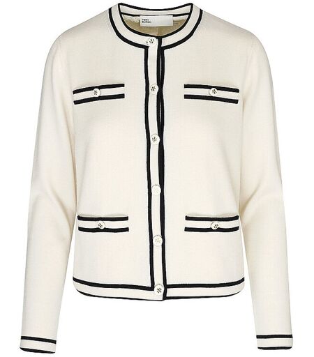 Damen Strickjacke aus angenehmer Merinowolle Feinstrick Rundhalsausschnitt Langarm Schließt mit Knopfleiste Eingriffstaschen auf der Brust und seitlich Knöpfe mit Logo Prägung Gerade geschnitten Farbbezeichnung: French Cream/Med. Navy Material: 100% Merinowolle ...