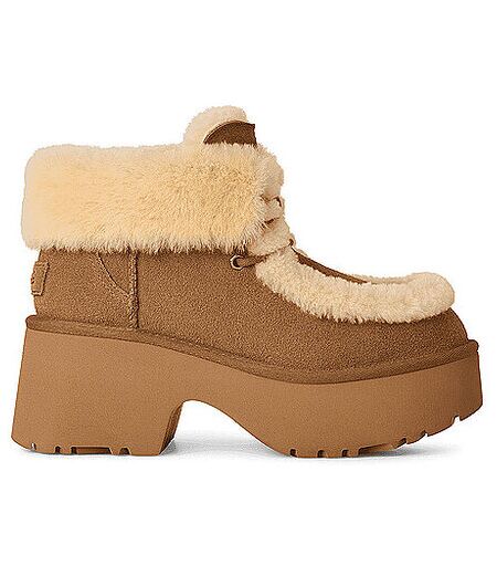 Ein Statement in Sachen Stil und Eleganz: Der Esmee Schnürstiefel hebt den klassischen UGG® Look auf ein neues Niveau. Inspiriert vom Classic Boot, kombiniert dieses Modell hochwertiges Wildleder mit einer offenen Naht und weichem Lammfellbesatz. Der umschlagbare Schaft lässt sich vollständig wenden und zeigt so noch mehr von dem kuscheligen Innenfutter. Im Inneren sorgt UGGplush™ für unvergleichlichen Tragekomfort, während die markante 7 cm hohe Plateau-Laufsohle aus leichtem EVA auf Zuckerrohrbasis zusätzlichen Halt und Leichtigkeit bietet. Damen Snowboots aus Veloursleder 10 mm breite offene Nähte aus Lammfell, umschlagbarer Schaft Baumwollschnürsenkel 17 mm dickes Futter aus UGGplush™ (60 % upgecycelte Wolle, 40 % TENCEL™ Lyocell, Rückseite aus 100 % recyceltem Polyester) 17 mm dicke Einlegesohle aus UGGplush™ (60 % upgecycelte Wolle, 40 % TENCEL™ Lyocell) EVA-Außensohle aus Zuckerrohr Textilbindung aus 100 % recycelten Polyesterfasern 7 cm Plateauhöhe Heißgeprägtes UGG® Logo Mit echtem Schaf- oder Lammfell Das Fell stammt aus Australien, Irland, dem Vereinigten Königreich oder den USA Es wurde künstlich gefärbt und behandelt Farbbezeichnung: Chestnut Material: Leder ...