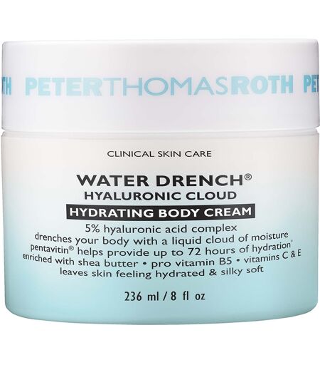 Achieve head-to-toe hydration with the Peter Thomas Roth Water Drench® Hyaluronic Cloud Hydrating Body Cream, a liquid cloud of moisture that feels weightless on the skin. Powered by a concentrated 5% hyaluronic acid complex and Pentavitin®, this potent lotion envelops the skin in rich nutrients to encourage moisture that lasts up to 72 hours. A blend of vitamins and shea butter protects against dryness, textural irregularities and fine lines, supporting a supple skin texture that lasts. Plus, its lightweight feel effortlessly sinks into the skin to quench, leaving it feeling conditioned and smoothed. ...