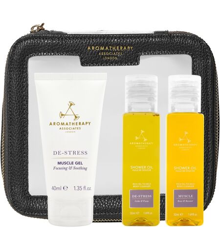 Ideal for gym goers and those on the go, the De-Stress Mind and Muscle Set by Aromatherapy Associates features a trio of scented bodycare saviours that offer skin and sense-soothing benefits. Set Contents: De-Stress Muscle Gel 40ml Lending an invigorating, warming effect on the muscles, this rosemary, black pepper, lavender and ginger-infused formula is perfect post-workout. Muscle Shower Oil 50ml An oil-to-milk formula that envelops the skin in a softening veil of moisture, while nuances of frankincense, petitgrain and chamomile provide olfactive calm. De-stress Shower Oil 50ml Enjoy a moment of self-care with this nourishing shower oil, laced with uplifting rosemary, ginger and black pepper notes. ...