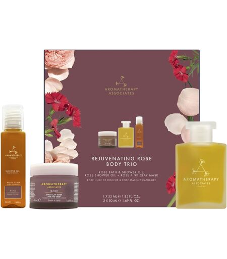 Feel refreshed and radiant with the Aromatherapy Associates Rejuvenating Rose Body Trio Gift Set. The luxurious collection acts as a ritual of self-love, designed to uplift the senses and nourish from head to toe. Set Contents: Rose Bath & Shower Oil 55ml Infused with a blend of damask rose, geranium and palmarosa, this bath and shower oil delivers a sensorial experience to leave the skin delicately scented. Rose Shower Oil 50ml Boasting an oil-to-milk texture, the formula envelops the skin to cleanse and hydrate for long-lasting softness and moisture. Rose Pink Clay Mask 50ml This mineral-rich French pink clay mask visibly refines and nourishes your skin and scalp, restoring softness and radiance while imparting the luxurious scent of rose. ...