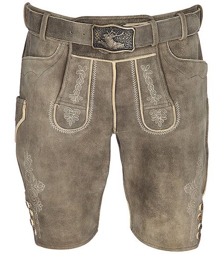 Modell: Karlo Farbbezeichnung: Rauchbraun Stick: Natur Kurzes Bein mit vier Knöpfen am Beinabschluss Stickereien in Kontrastfarbe Geknöpfter Latz Zwei Taschen an der Vorderseite Eine Gesäßtasche Seitliche Messertasche Bundweite durch rückseitiges Lederband individuell verstellbar Hochwertige Ausführung Material: 100% Leder Pflegetipp: Lederspezialreinigung ...