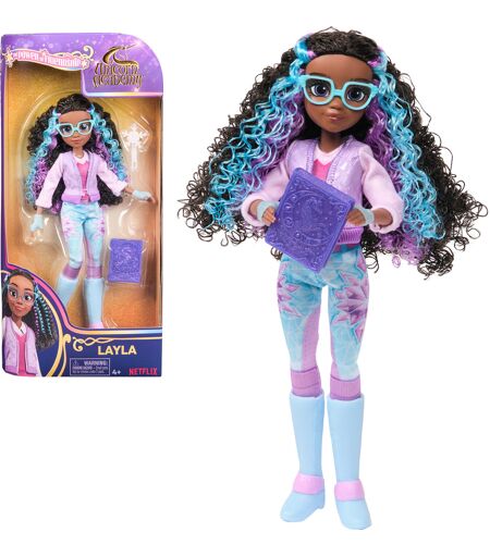 Layla, die Heldin der Unicorn Academy, als vollbewegliche Ankleidepuppe von Spin Master: In ihrem Outfit mit wunderschönen blau-lila gesträhnten Haaren ist sie etwa 24 Zentimeter groß. Ihre abnehmbare Kleidung besteht aus Top mit lila Weste, Reithose mit Eis-Magie-Symbolen sowie hellblauen Stiefeln. Als Accessoires bringt sie eine Bürste sowie ein Buch mit. Layla besitzt neun bewegliche Gelenke, damit sie auf ihrem seelenverwandten Einhorn Glacier (separat erhältlich) sitzen, die Zügel halten und reiten kann. ...