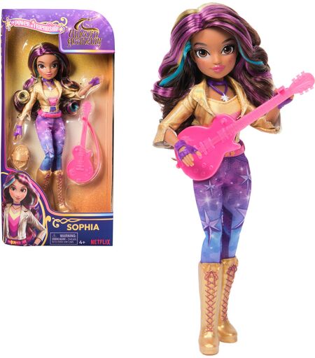 Sophia, die Heldin der Unicorn Academy, als vollbewegliche Ankleidepuppe von Spin Master: In ihrem Outfit mit wunderschönen Regenbogensträhnchen im Haar ist sie etwa 24 Zentimeter groß. Ihre abnehmbare Kleidung besteht aus Jacke, Regenbogen-Top und Reithose mit Stern-Symbolen sowie goldenen Stiefeln. Als Accessoires bringt sie eine Bürste und eine Gitarre mit. Sophia besitzt neun bewegliche Gelenke, damit sie auf ihrem seelenverwandten Einhorn Wildstar (separat erhältlich) sitzen, die Zügel halten und reiten kann. ...