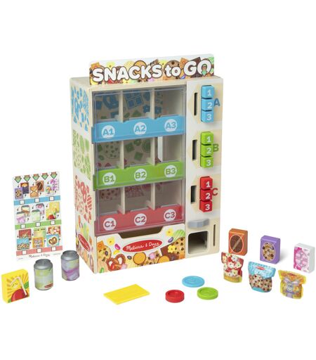 Spielzeug-Essensverpackungen sortieren, den Spielzeug-Verkaufsautomaten füllen, Spielmünzen einstecken und dann nach Drücken des entsprechenden Knopfs beobachten, wie die gewünschten Artikel in die Sammelschublade fallen: Dieses Snackautomaten-Spielset von Spin Master Melissa & Doug hilft Kindern ab 3 Jahren auf spielerische Art, das Prinzip von Ursache und Wirkung zu lernen. Außerdem bietet es die Möglichkeit zu fantasievollem Spiel und gibt Anregungen zum Sortieren, Zählen und Erkennen von Buchstaben. Und das alles mit hochwertiger, langlebiger Verarbeitung aus Holz und ganz ohne elektrische Teile und Batterien. Dieses Spielset besteht insgesamt aus 19 Teilen und bereichert jedes Kinderzimmer! ...