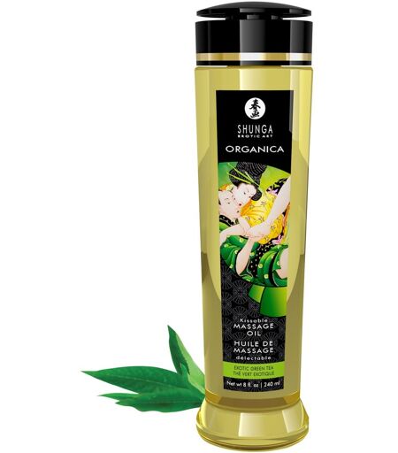 Luxuriöses Organica Kissable Massage Oil Exotic Green Tea von Shunga mit sanftem subtilem Grüntee-Aroma, das bei der Partnermassage die Sinne weckt und zum Küssen und Vernaschen einlädt. Das vegane Massageöl besteht aus 100% kaltgepressten natürlichen Ölen und enthält hautpflegendes Vitamin E. Es gleitet sanft und leicht über die Haut, ohne ein unangenehm fettiges Gefühl und Rückstände zu hinterlassen. Im Gegenteil, es pflegt die Haut seidig weich! Dazu ist sehr ergiebig – der Inhalt reicht für viele sinnliche und leidenschaftliche Ganzkörpermassagen. 240 ml. ...