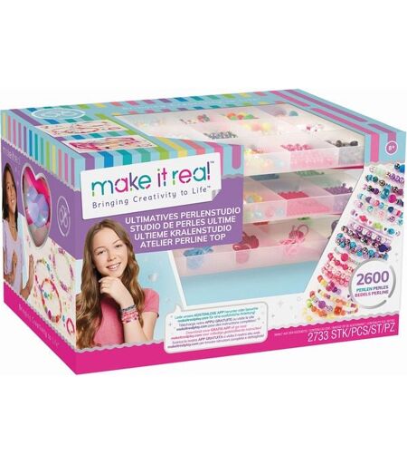 Grosses Set zum Herstellen von Armbändern, Halsketten und Ringen. Inhalt: 1 Aufbewahrungsbox mit 3 Schubladen, 2600 Perlen, 120 Biegeringe, 8 gewachste Schnüre (8m), 4 elastische Schnüre (4m), 1 Anleitung. ...