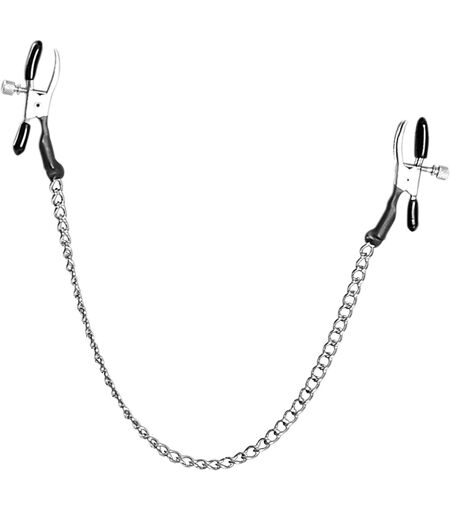 Diese Nippelklammern nehmen die Brustwarzen fest in die Zange und schmücken die Brust mit einer coolen Metallkette. Die Klammern inklusive Metallkette sorgen mit 60 g für den richtigen Zug an den Brustwarzen und sind in der Druckstärke individuell mit den Stellschrauben einstellbar. Der weiche Gummiüberzug sorgt dabei für mehr Tragekomfort. Das perfekte Accessoire für Einsteiger und für Kenner! Gesamtlänge 43 cm. Gesamtgewicht 60 g. Metall, Gummi. ...