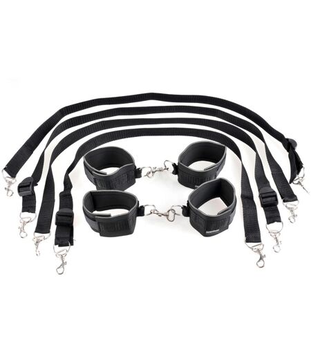 Mit diesem Bettfessel-Set ist fast jede Bondage-Fantasie umsetzbar. Die Hand- und Fußfesseln sind mit Klett zu schließen und können aneinander befestigt werden. Die beiliegenden Seile mit Karabinerhaken ermöglichen aber auch die Fesselung jeder einzelnen Extremität an zum Beispiel einem Bettpfosten. Dabei sind die Fesseln besonders reißfest, sodass sicherer Spaß garantiert ist. Polyamid. ...