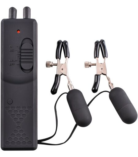 Diese Nippelklammern nehmen die Brustwarzen fest in die Zange und bringen sie mit 3 unterschiedlichen Vibrationsmodi zum lustvollen Erzittern. Die Klammern sorgen mit jeweils 42 g für den richtigen Zug an den Brustwarzen und sind in der Druckstärke von sanft bis heftig individuell mit den Stellschrauben einstellbar. Der weiche Klammer-Gummiüberzug sorgt dabei für mehr Tragekomfort. Die Vibration (10 Modi) lässt sich über die kabelgebundene Fernbedienung bequem per Knopfdruck steuern. (Batterien bitte extra bestellen: 2 x AA). Kabel inklusive Nippelklammer 28 cm lang, Ø 3,6 cm. Gesamtgewicht 84,4 g. Metall, ABS, Gummi. ...