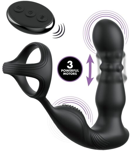 Der Ass-Gasm Slide & Glide von Anal Fantasy Elite Collection kombiniert einen Perlenmassage-Analvibrator mit einem Perineum-Noppenstimulator und einem Penis-/Hodenring. Für intensiven Rundum-Analspaß, der mit der praktischen kleinen Fernbedienung bequem steuerbar ist – beim Solo oder spannenden Partnerspiel. Der Ass-Gasm Slide & Glide ist ergonomisch geformt und komplett aus Silikon gefertigt für höchsten Tragekomfort. Die dehnbare Ringkombi schmiegt sich angenehm fest an Penis und Hoden und kann die Erektion wirkungsvoll unterstützen. Gleichzeitig massiert der eingeführte Plug mit den sich auf-und-ab-bewegenden Perlen intensiv den Analkanal und mit Vibrationen die Prostata. Dazu wird der Damm von vibrierenden Noppen verwöhnt. Alles ist fest miteinander verbunden und wird sicher in Position gehalten. 3 leistungsstarke leise Motoren sorgen für die starke Perlenmassage im Plug, die kraftvollen Vibrationen in der Plug-Spitze und die intensive Vibration im Perineum-Stimulator. Perlenmassage und die Vibrationen sind in jeweils 3 Geschwindigkeiten und 7 Mustern getrennt voneinander steuerbar. Entweder mit der Fernbedienung oder direkt am Toy. Auch in Bad und Dusche, da wasserdicht. Zudem mit Tastensperre ausgestattet für diskrete Aufbewahrung und Transport. Wiederaufladbar – inklusive USB-Ladekabel. Gesamtlänge 19 cm Einführlänge 11,8 cm, Plug-Ø max. 3,5 cm Ring-Ø 4,2 cm (dehnbar). Gewicht 220 g. Silikon, ABS. ...