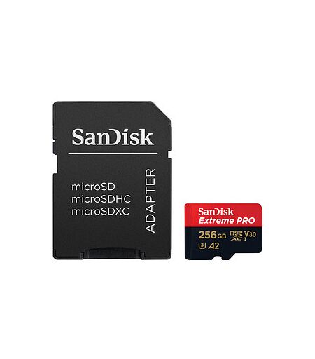 Organisiert und sicher speichern: die SanDisk Speicherkarte microSDXC-Card Extrem PRO 256 GBOb für den privaten Gebrauch oder im beruflichen Umfeld – die SanDisk Speicherkarte microSDXC-Card Extrem PRO 256 GB unterstützt vielfältige Anwendungsbereiche. Sie ist eine praktische Lösung für die Speicherung von Dateien jeglicher Art. In Anbetracht ihrer Abmessungen bieten Karten vom Typ microSD eine beeindruckende Performance und eignen sich daher bestens für zahlreiche technische Geräte.Auf der Suche nach etwas Besonderem?Diese besonderen Eigenschaften stecken in der SanDisk Speicherkarte microSDXC-Card Extrem PRO 256 GB: A2 Leistungsstandard für schnellere App-Performance, temperaturbeständig, wasserdicht, stoßfest und röntgensicher. Mithilfe des mitgelieferten SD-Adapters können Sie die Karte auch in Geräten nutzen, die einen SD-Kartenslot aufweisen.Großer SpeicherplatzDie Speicherkapazität beträgt 256 GB. Sie haben somit Platz für rund 160.000 Word-Dokumente (1-2 MB pro Dokument), ca. 96.000 Fotos in Standardqualität, 64.000 Songs im MP3-Format oder ungefähr 64 Stunden Videomaterial in Full-HD-Qualität.Wie hoch ist die Lese- und Schreibgeschwindigkeit?Durch den Geschwindigkeitsstandard UHS-I, V30 und die Geschwindigkeitsklasse V30 profitieren Nutzer von einer ultraschnellen und effizienten Datenverarbeitung, die speziell auf anspruchsvolle Aufgaben ausgelegt ist. Mit einer Lesegeschwindigkeit von 200 MB/Sek. arbeitet das Modell äußerst schnell. Die Schreibgeschwindigkeit beträgt 140 MB/Sek. Sie sagt aus, wie schnell Daten von einem Gerät auf der Karte gespeichert werden können.Speichern Sie Ihre Daten sicher und effizientDie Lieferung der SanDisk Speicherkarte microSDXC-Card Extrem PRO 256 GB erfolgt inklusive SD-Adapter, 2 Jahre RescuePRO Deluxe Software. ...